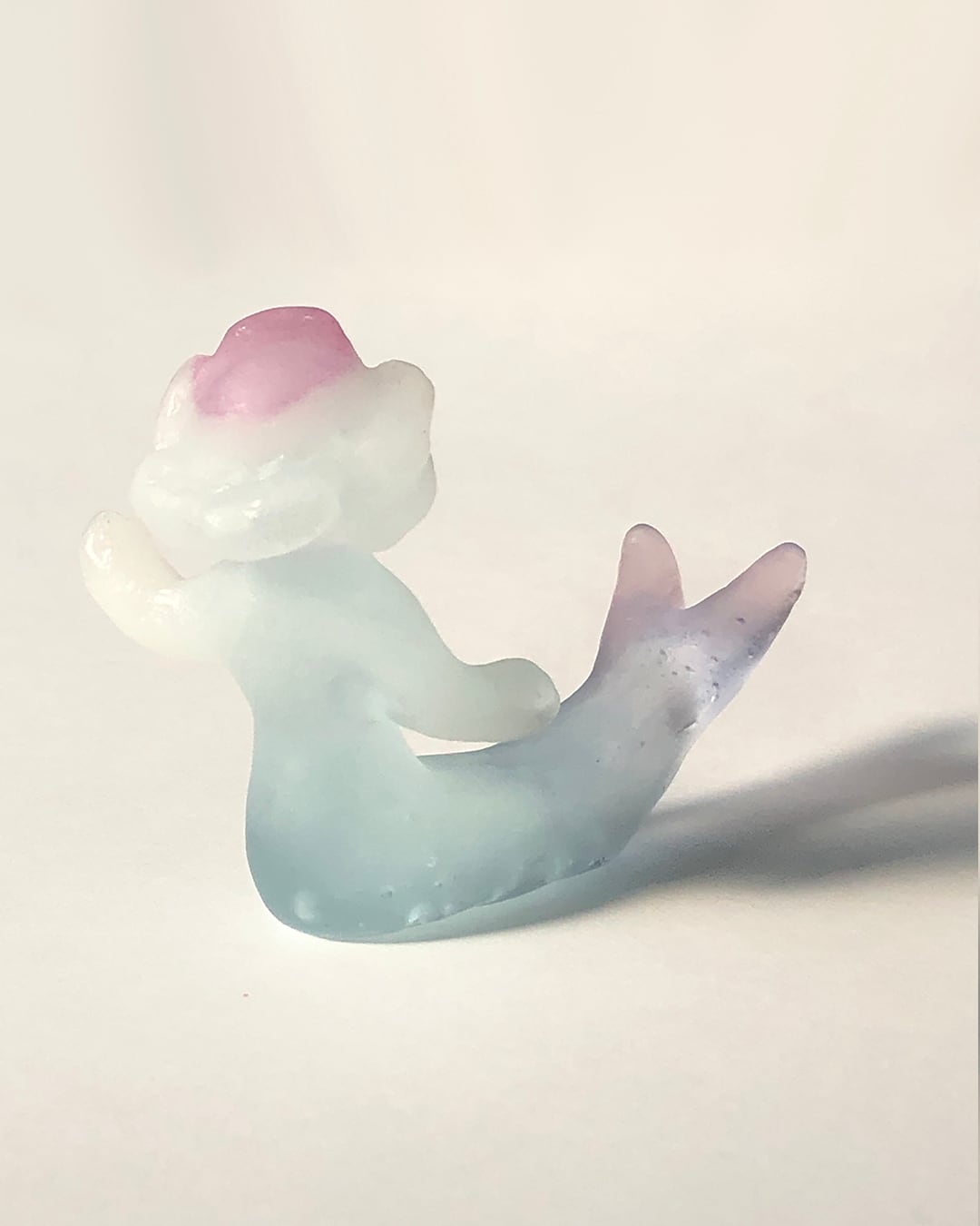 淡い半透明のなかに気泡がみえる、小さな水の精のような人魚。頭にうすい赤紫の帽子を乗せているようなところが可愛いです。