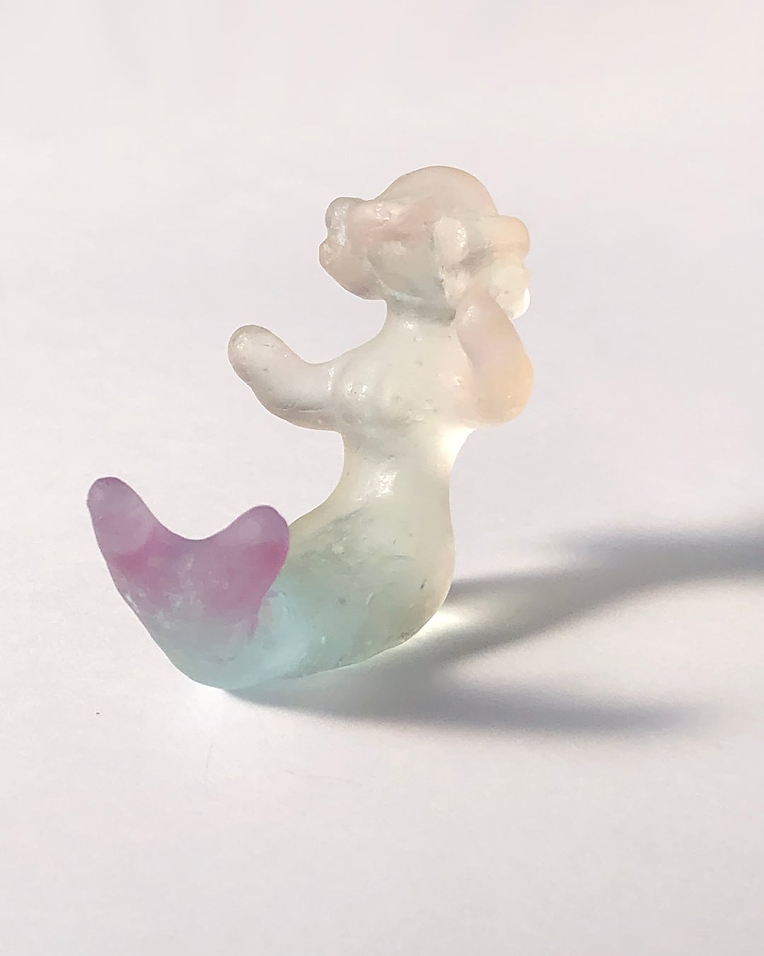 手のひらに乗る小さな鋳造ガラス(パート・ド・ヴェール)の手法で制作した人魚たちシリーズの13番目の作品。